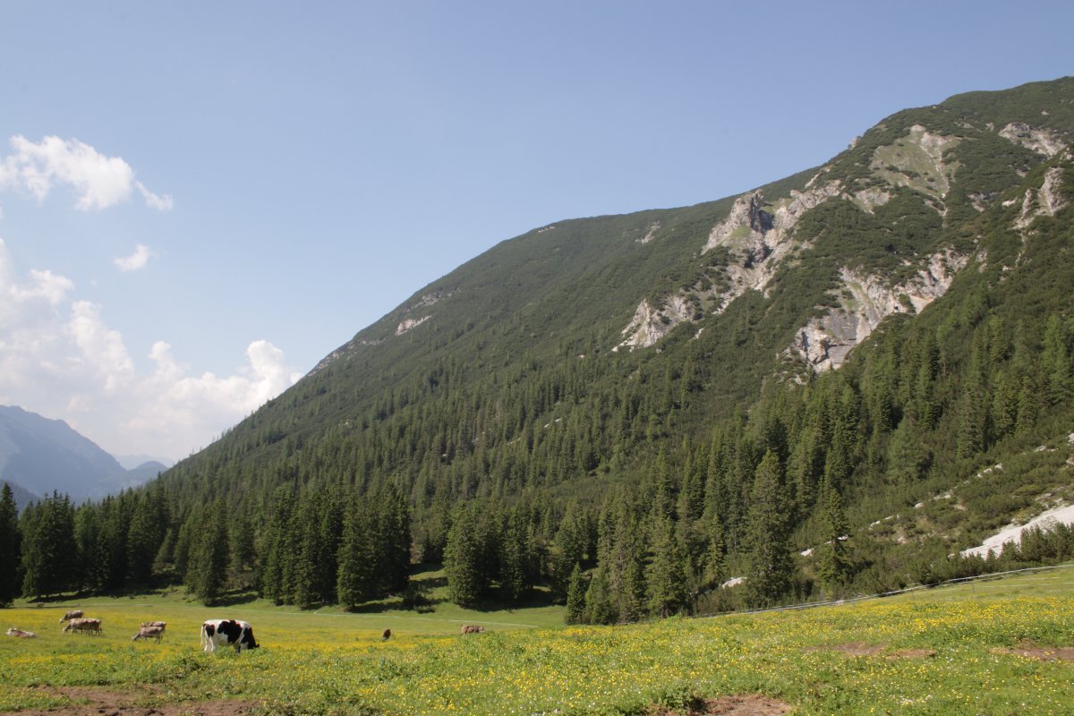 Der nächste Teil der Strecke beginnt mit der Querung des Gleirschbaches, die mit einem abrupten Richtungswechsel verbunden ist. Bis zur Oberbrunnalm sind danach rund 4 km und 400 hm auf gutem Untergrund zu absolvieren, im Prinzip das Isertal (Isertal, nicht Isartal) aufwärts, stets einige Höhenmeter oberhalb des Talbodens, an der Flanke von Hochwaldkopf und Zunterkopf entlang. Zwar tauchen ab und an steilere Rampen auf, aber insgesamt ist der Weg problemlos machbar und bereitet aufgrund der umgebenden Landschaft, der herrlichen Flora und der herrschenden Ruhe pure Freude.